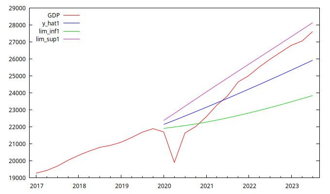 - Observe los resultados numéricos referentes a las previsiones del PIB calculadas con los resultados de los modelos 1 y 2.