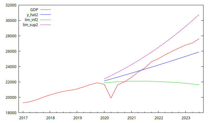 GDPno son estacionarios, lo que provoca que la varianza de las previsiones crezca con el horizonte. El Modelo 1 tiene una raíz unitaria, por lo que las bandas de confianza son crecientes. El Modelo 2 tiene dos raíces unitarias, por lo que los intervalos de confianza crecen de manera acelerada. - El inesperado confinamiento causado por la COVID-19 hace que el PIB observado en el primer trimestre de 2020 quede fuera de las bandas de confianza en ambos modelos.